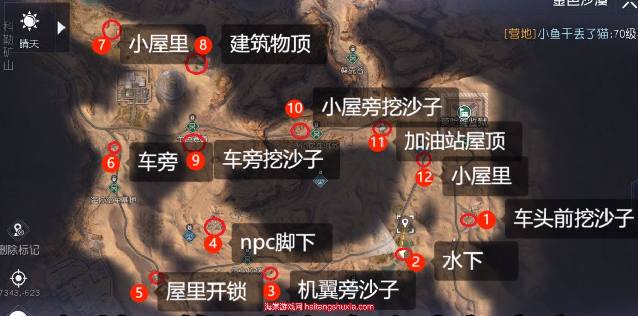 2、怒沙油气箱在地图上显示为一个小火苗,但是有几个被沙子埋住了的不显示,大家根据上图描述去找就好了