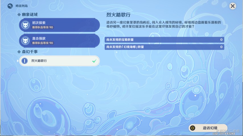 传送到辛焱活动「鸣弦列岛」,打开活动,可以查看森幻千事下烈火踏歌行里,尚未发现的宝箱数量,以及尚未发现的「幻境海螺」数量,当数量为0时,就是没有遗漏