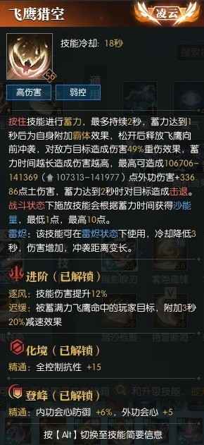 使用【鹰扬霆击】二段会根据命中敌人数量减少冷却,1人为2秒。2-5人为4秒,6-9人为7秒,9人以上为10秒。