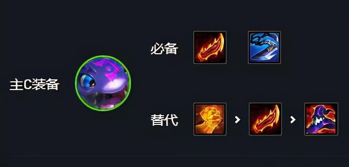 在装备方面大嘴必备羊刀,也是此阵容最优先合成的装备,高额的攻速加成可以让大嘴百分比普攻伤害的收益更大,其次是正义之拳,保证大嘴的血量回复,从而提高生存能力,最后一件则是巨杀,可行更快速的收割敌方的前排,总之仅需这三件装备就能保证阵容的输出能力。