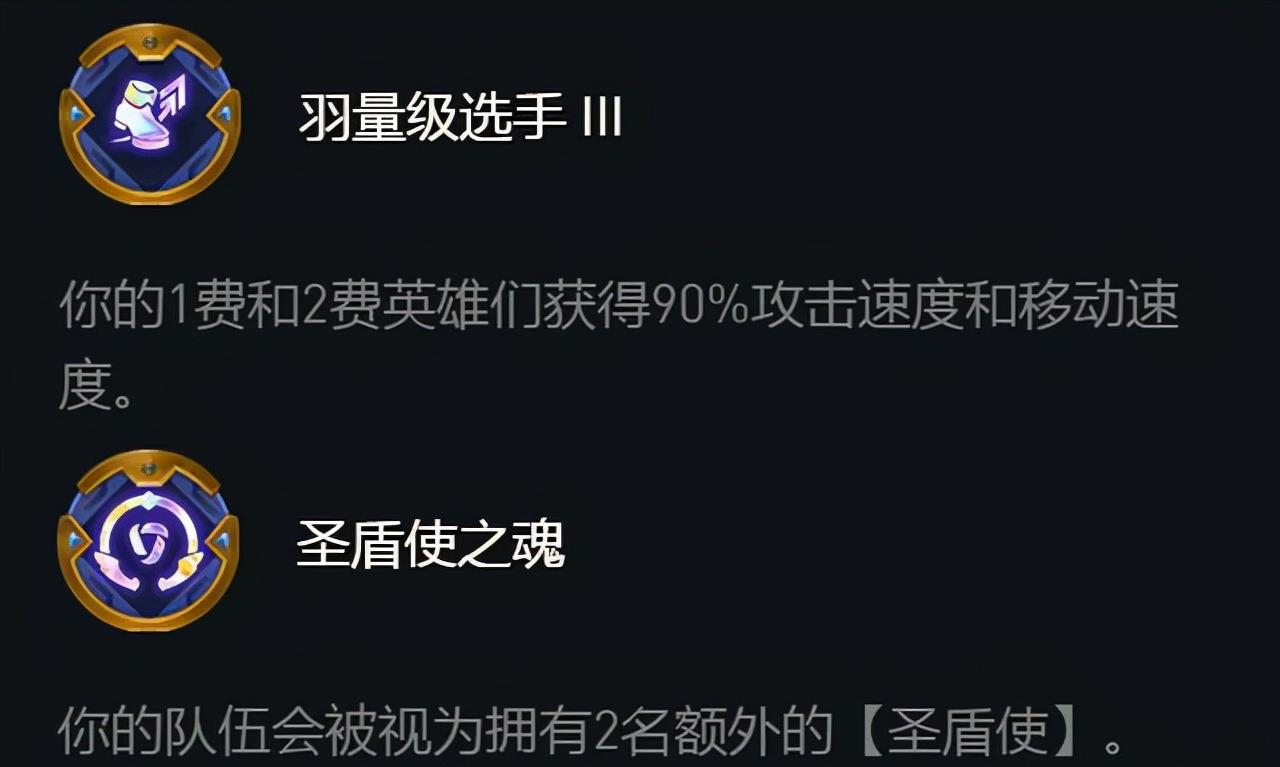 当然除了阵容前期的运营之外,海克斯芯片的选择也非常重要,最适合圣盾大嘴阵容的芯片就是羽量级选手,效果可以让2费以内的棋子获得高额的攻速和移动速度的加成,大大提高了圣盾大嘴阵容的启动速度和输出能力,另外圣盾使之魂也是不错的选择,提高卡萨丁和盖伦的生存能力,可行拥有这些芯片就等于吃鸡稳了。