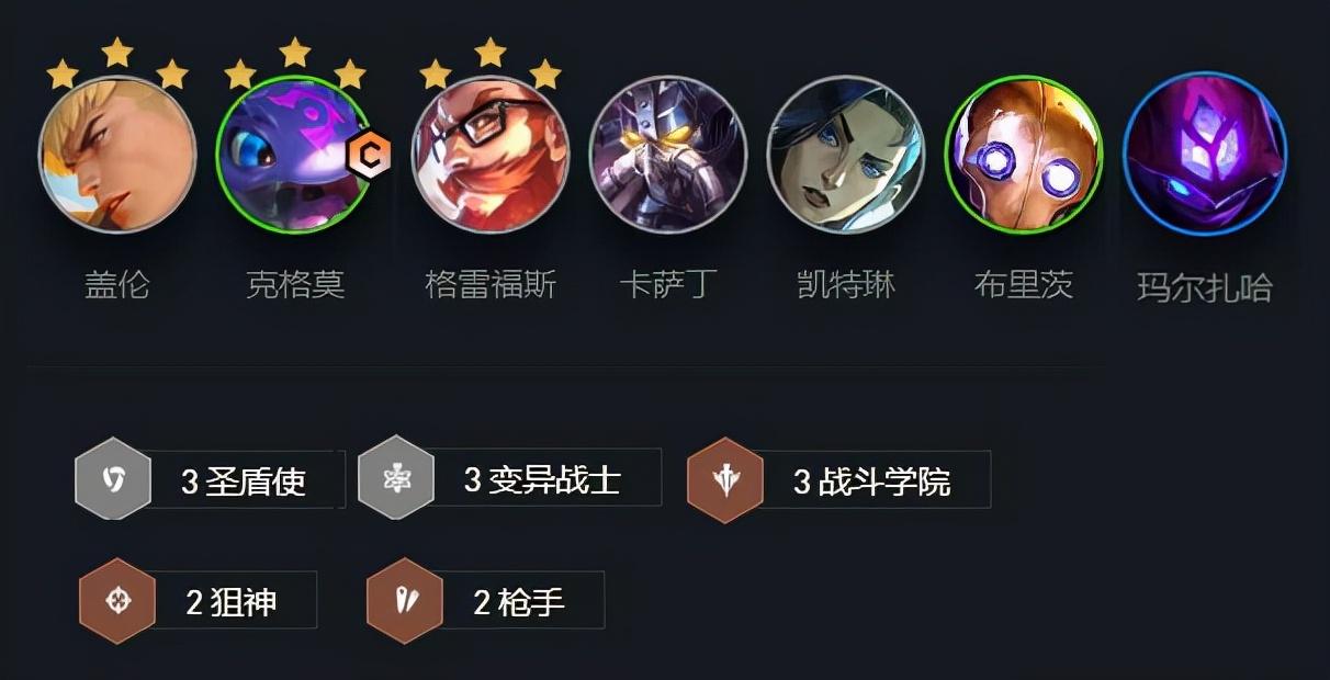 阵容七人口即可成型,棋子包括盖伦、卡萨丁、女警、男枪、机器人、马尔扎哈和大嘴,羁绊效果为三圣盾、三变异、两战斗学院、两枪手和两狙神。
