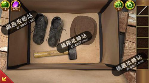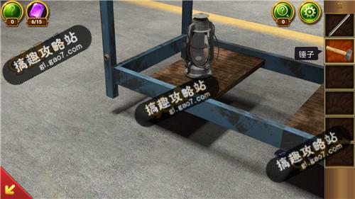 3.点击左边的铁楼梯下面有一个灯,用锤子敲开拿到里面的金币