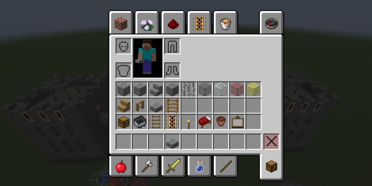 共11款材料建筑材料:圆石、石砖、石砖楼梯、錾制石砖(考虑美观性灵活加入)、铁栅栏、四种颜色玻璃,橡木楼梯、栅栏、石砖台阶、梯子。
