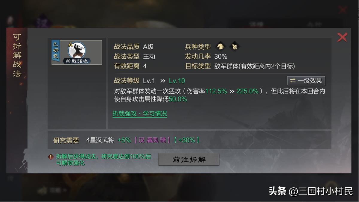 这个战法可以拆解四星马腾和徐晃获得。这个战法一般是给夏侯渊和汉吕使用,属于必拆战法,但如果暂时用不上可以先不研究。