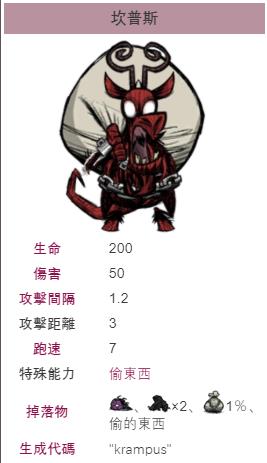 坎普斯是一个《饥荒》中会偷走玩家物品的小偷,它可以偷走你的背包,甚至会破坏你的箱子拿走物品,直到画面中没有东西可偷,它就会躲进它的袋子里然后消失。