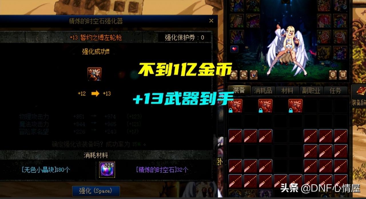 因堇青石材料物价下跌,“红尾乔纳森”强化火了,比凯丽还要节省金币。时空石强化装备,不会增加概率,但能少花冤枉金币,步骤策略分两步走: