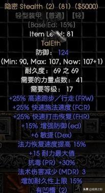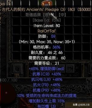 注释:高速格挡(FBR)、所有抗性,无法冰冻,还有25的MF,前期这简直就是极品装备,再也不怕刷A2boss都瑞尔时被冻住减速。