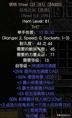 注释:基本都是有用的属性,近战职业都可以做,用这货打通普通难度会容易很多。狼Dru由于使用双手武器,建议使用巨斧为底材,到了A4之后再换卓越之斧。