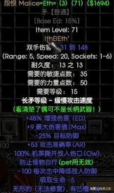 注释:这货是前期必做的,给A2雇佣兵米山大叔使用。不仅提高雇佣兵伤害,而且拥有最高17级的冥思光环,大大提高自己和队友的回蓝速度,从此告别大蓝瓶了。第一个应该12号符文Sol用在此处。后期尸爆NEC可以用来做铁魔最便宜。