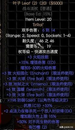 注释:看着满是火焰技能加持就知道这个法师用最爽,尽量选天生两孔带火系技能的。这件武器能让火法在普通和噩梦难度横着走。