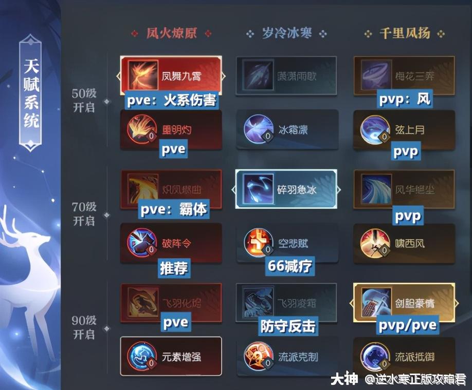 ?备注:天赋可根据自身携带的技能进行调整。神相的天赋pvp携带更多的选择“千里凤扬”方面的凤系天赋,打出控制和伤害。