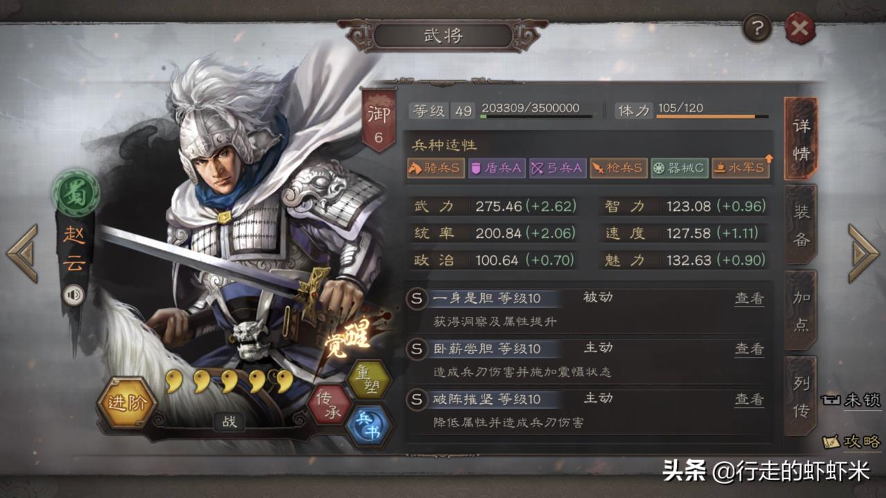 赵云:后发制人(武将:皇甫嵩传承战法)、自愈(武将:董袭传承战法),赵云20级(觉醒)前,武将可以带两个战法,赵云自身属性高并免疫控制,多兵种适性A+,后发制人可以反击伤害。