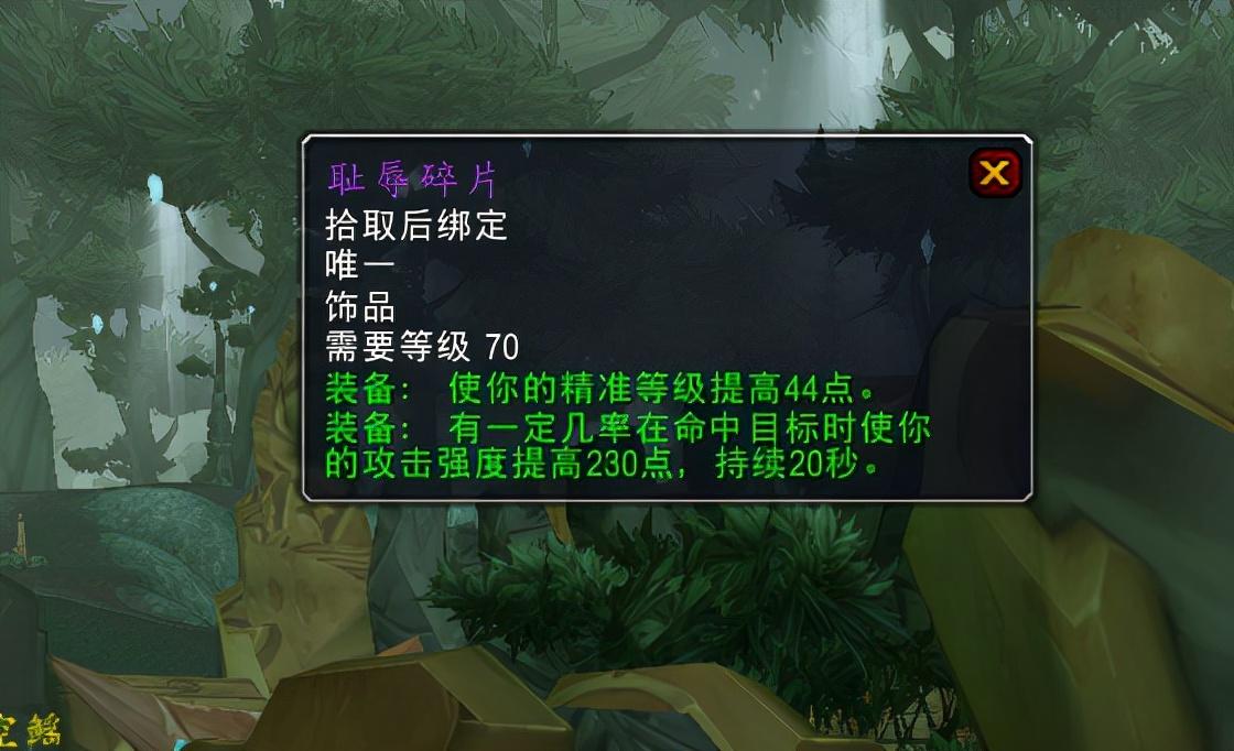 对于近战DPS而言,耻辱碎片几乎是所有玩家的毕业装,它最优质的地方在于被动的44点精准等级。15.6点精准等级就可以降低目标1%躲闪和招架,那么44点精准可以减少BOSS2.8%的躲闪的招架,即使在BOSS背面只有躲闪生效,这也是一个非常优质并且稳定的DPS提升。