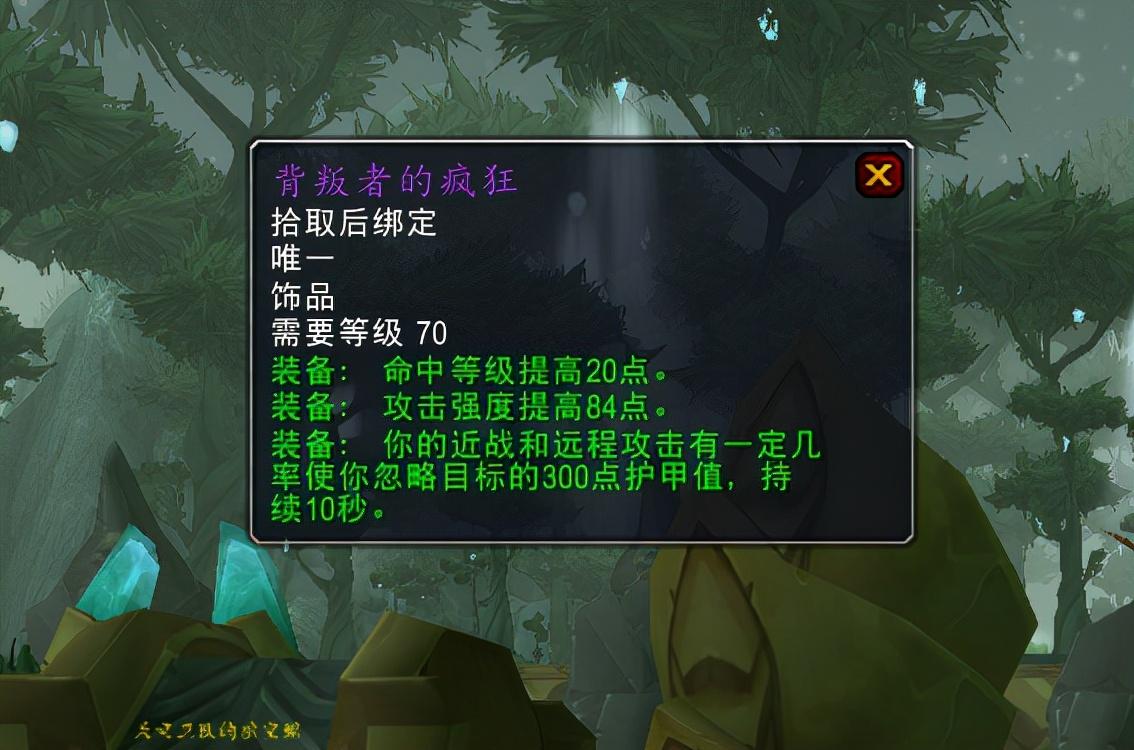 背叛者的疯狂的被动属性是近战和远程攻击有一定几率使你的护甲穿透提高300点,持续10秒。这件装备的特效在近战双持DPS可以达到40%的覆盖率,远程和双手近战DPS的覆盖率为35%。300点破甲可以提升近战玩家3%的DPS,那么被动提供的总DPS为1.2%。这个效果就太弱了,和龙脊奖章的差距在5%以上,即使加上主属性的3.5%DPS加成,和龙脊奖章的差距依然在1.5%以上,盗贼使用它甚至比不上星界螺旋,而猎人使用它还会有命中超标和实际覆盖率低(35%左右)的问题,因此小探不推荐任何DPS高价拿背叛者的疯狂,随缘入手即可。