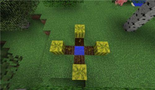 如图所示,这是一种错误的种植示范,这种种植策略只有最外层并且与泥土方块没有高度差的瓜藤才可行结出果实。