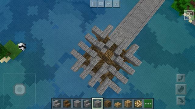 接下来我们开始铺路搭桥,可以随机选择一面作为通向凉亭的小路,然后如图用石砖将路铺起来,一直延伸到陆地即可,两端放上萤石灯来增加晚上的光源。注意这里在桥的两边护栏处有一点小小的细节,大家可以参考图片去做一下,两个石砖楼梯对在一起倒放即可做出这种效果。这样我们的桥和地基就都做好了,然后我们正式开始准备做凉亭。