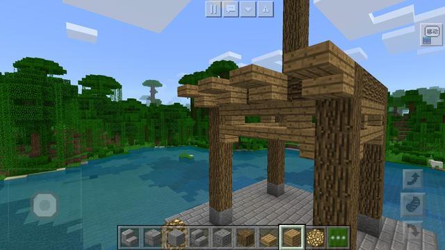 接下来我们开始做建筑的主体部分,先在地基中间放上四根柱子,柱子最下面是石块作为柱础,每根柱子七格高包括柱础,间距5格,柱子的材料为橡木。然后在四根柱子的上方再围绕一层橡木作为檐枋,在上方中心处延伸五格左右确定建筑的中心位置,实际情况如图,搭建出亭子整体的框架。