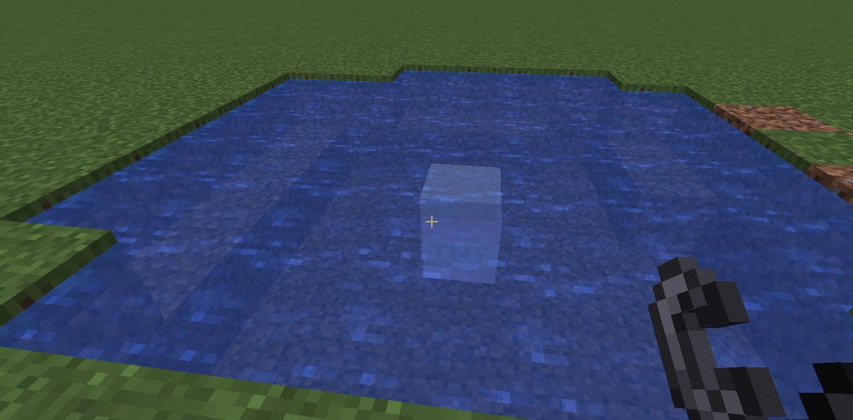 而如果在水里有咱们想要的矿材,或者不得不炸掉水中的东西时,可以试着在TNT上方放置一个重力方块,如沙子,砂砾,铁砧等,然后点燃TNT,重力方块会掉落,和点燃TNT的碰撞体积重合。