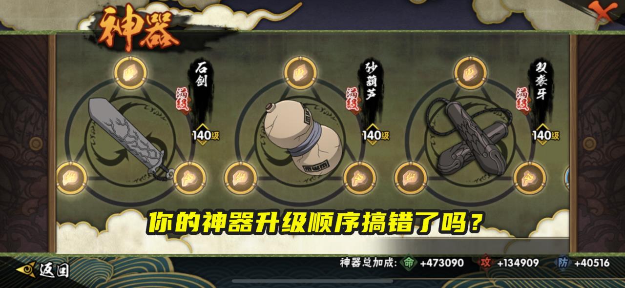 火影忍者手游中有各个系统都跟战力有关联,忍者的招募和升星,装备的升级和进阶,通灵的修炼和进阶以及忍具和饰品等渠道,这些都是跟你的战力息息相关。而这些升级战力的渠道中,有一个渠道稍微有点特殊,如果你不按照正常的顺序来升级的话,在同样材料消耗的情况下,你可能会比按照正常顺序升级的玩家战力要低,这个系统就是神器。