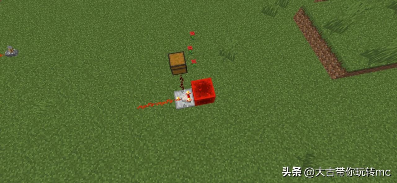 而另一张呢就是减法模式,就如上面两个图一样,如果你在比较器后面放上一个装东西的箱子,那么它传输的电量是有限的,而在比较器旁边再放一个红石块,那么红石比较器就会做出减法选择,红石块的能量减去箱子的能量,就是比较器传输的能量了。