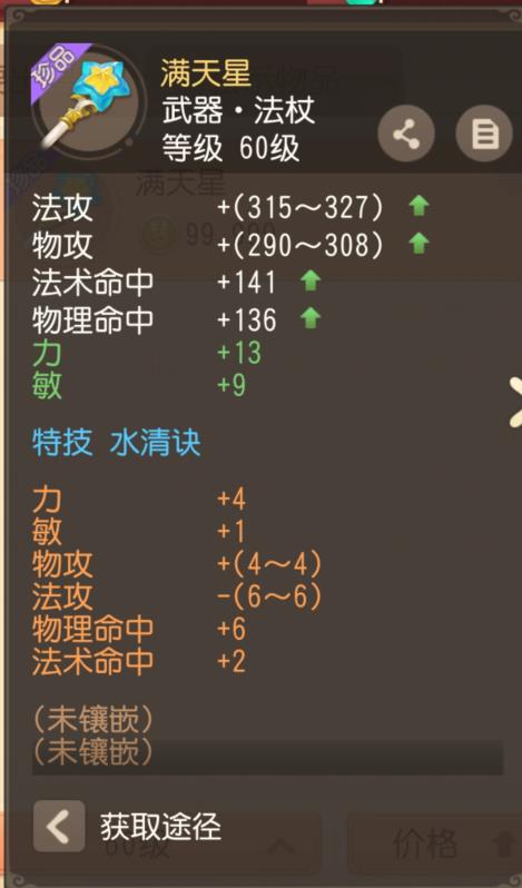 以这件60级带“水清诀”的满天星为例,我们只需要看法攻(315)和法术命中(141),对比一下90级的装备,攻击只有100多点,2个8级的月亮石就能弥补,换一个水清诀,绝对是不亏的。法宝入梦铃+芭蕉扇