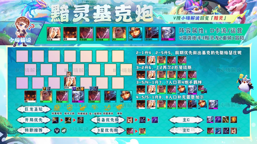 阵容解析:12.17b版本的热补丁中,削弱了4/6炮手的伤害加成,以及厄斐琉斯单卡的伤害,对于4基克炮手削弱影响有点大,但是6炮手的伤害还是依然是版本首选阵容。大成6炮手开局可行直接融化掉神龙努努,但是容易被神龙敖兴秒。