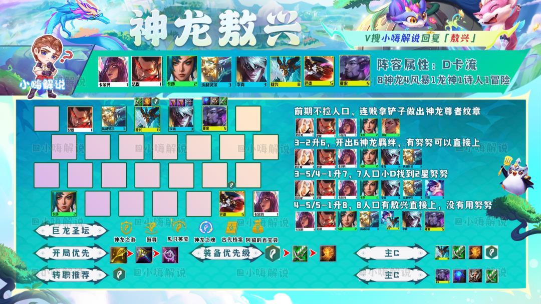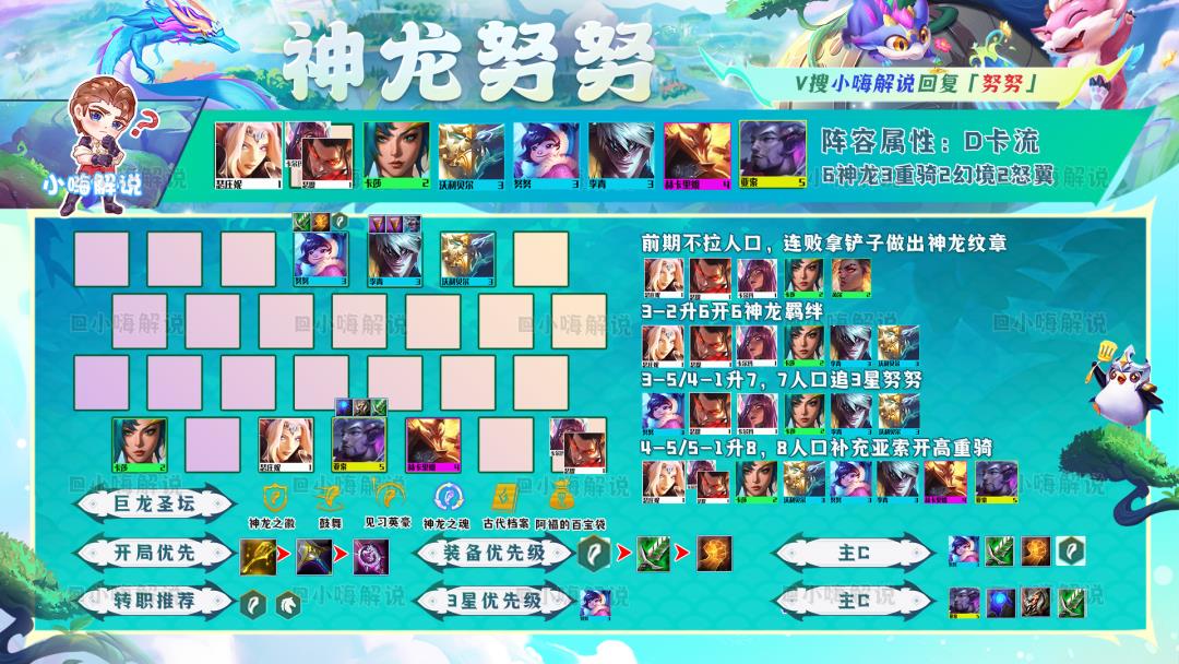 神龙努努的玩法攻略非常简单,无同行在7人口追到3星努努,有两个神龙纹章就先拉8开8神龙再追3星。有同行则先追到2星努努,再速8找敖兴,6神龙4风暴的1星敖兴在5阶段就可行锁血,大成可行9人口找到2星敖兴基本稳定吃鸡。