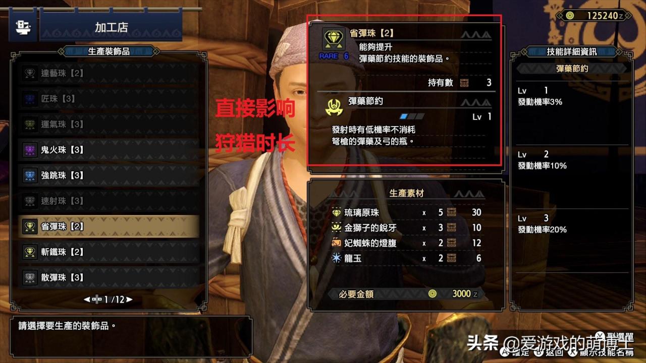 装饰品则选择1颗装填珠(优先)、2颗攻击珠、3颗省弹珠、3颗抑反珠、2颗早填珠。这里面省弹珠其实要用到“琉璃原珠”,如果没有的话,只能在狩猎操作中多回营地补给了,也变相地增加了狩猎时长。狩猎操作中需要携带的道具有爆裂果实、斩裂果实、LV3火药粉、彻甲榴弹(LV1及LV3)、斩裂弹、汉方药等等。
