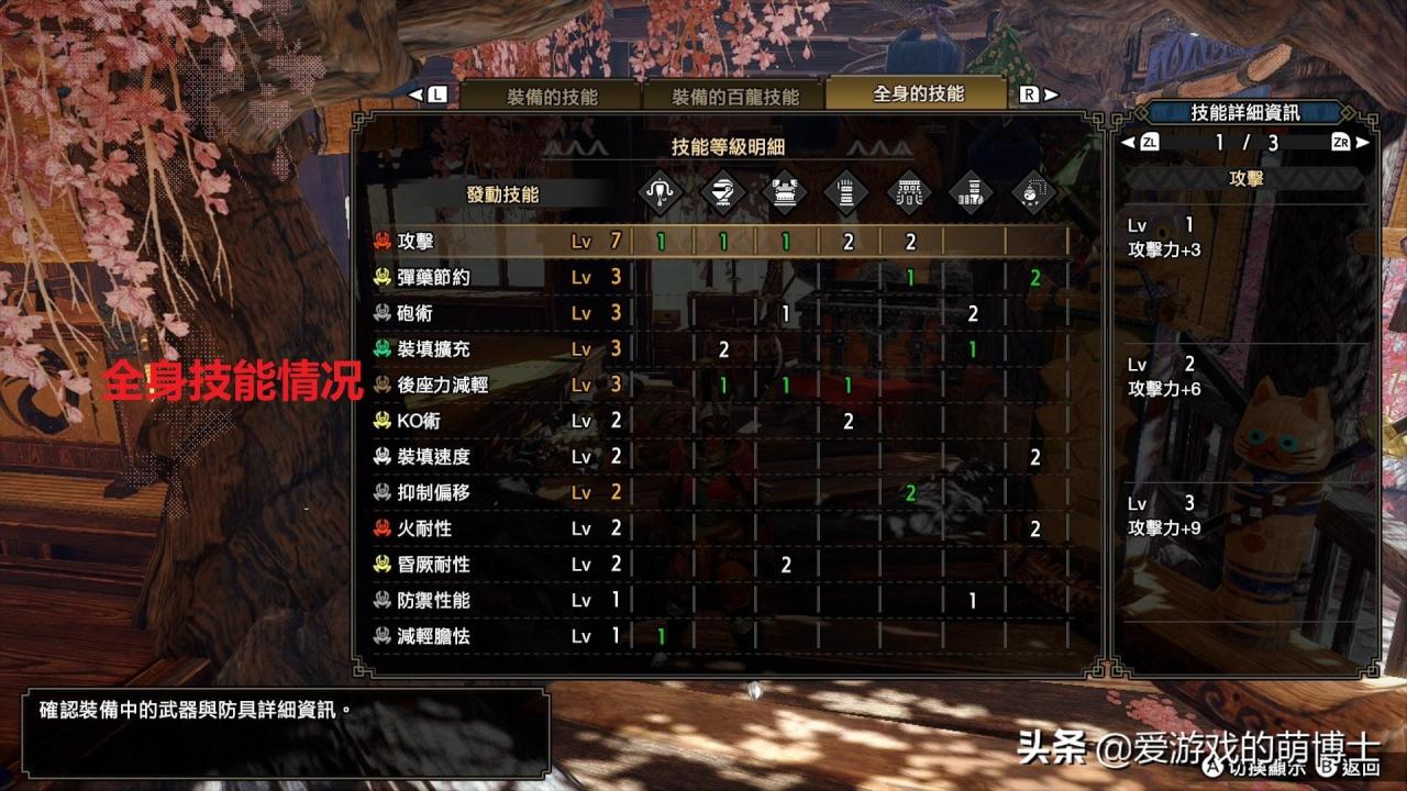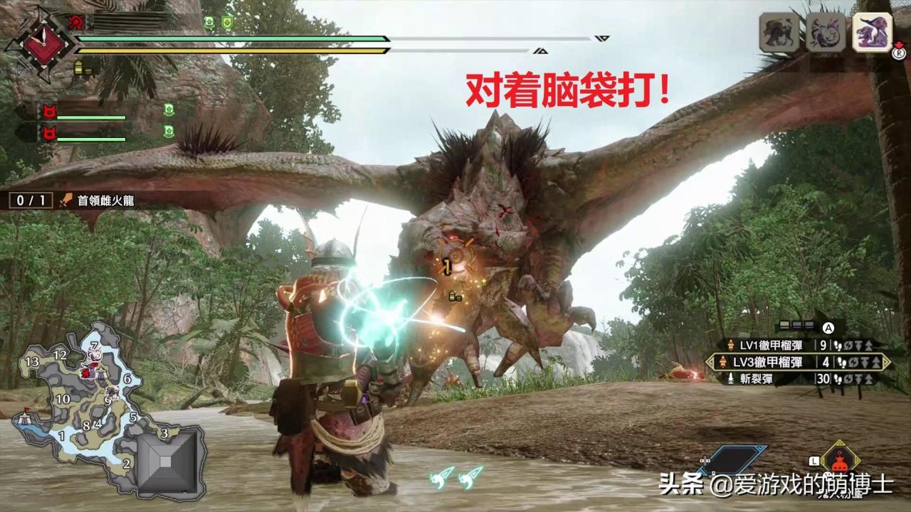猫饭技能里最好有一个“团子弱小招来”,可以让大型怪物变弱,接下来我们就可以去刷珠子了,选择的怪物为首领雌火龙(HR40解锁)。前面准备了那么多,轮到步骤的时候其实就变简单了,我们使用彻甲榴弹(LV3)在中远距离攻击雌火龙的头部,几发之后它就会昏厥!在怪物昏厥或倒地的时候,再用斩裂弹打击头部!有起爆龙弹时,倒地时也配合使用。