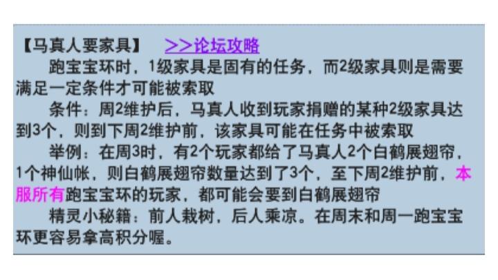 在这里,还有个小窍门,每个区专门跑宝宝环的就那么几个人,如上图所说,可以联合这些专门跑的人,在更新过后,每个人分别交给马真人3个一样的二级家具。