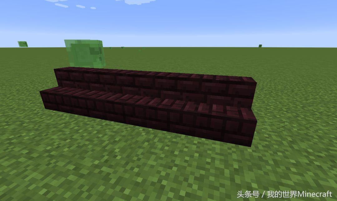 首先摆放一个5格宽的台阶,这是用于走进末地传送门(末地传送门并不像下界传送门那样立着摆放,而是平铺在平面上),台阶的材质推荐使用地狱砖,不为别的,就是为了增添一丝神秘和黑暗的气息。