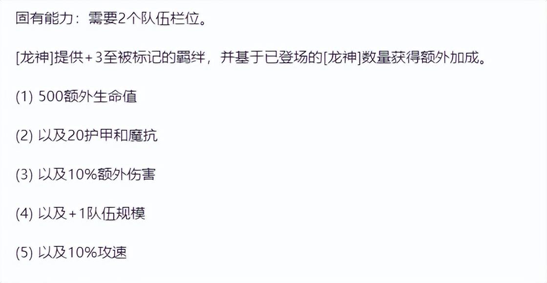 S7.5版本一个龙神英雄上场的话可以获得500点额外生命值,双龙神在这个基础上可以获得20点护甲魔抗,三龙神增加10%的额外伤害,四龙神队伍人口加1,五龙神全员获得10%额外攻速,乍一看这些效果似乎都比较一般,但大家不要忘记了龙神羁绊的效果与其他羁绊不一样,这些都是可以叠加的,也就是说四龙神在享受队伍人口加1的同时之前的生命值护甲以及攻速的增加也都是具备的,所以这么一看是不是龙神羁绊格外的强势呢?