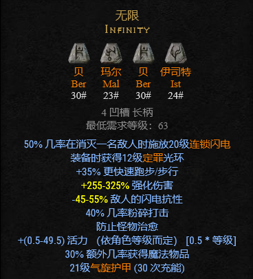 之所以说闪电法师是升级玩法就是因为闪电法师对装备需求很高,因为闪电法师输出主要是闪电伤害,她并不像冰火法那样还有两种伤害对抗火免或者冰免怪。如果不能破电免的话那就很难受,而破电免的装备都不便宜,至少需要符文之语无限(30#+23#+30#+24#)起步,12级的定罪光环可以减少85%的抗性,如果是法师自己拿该符文武器的话,还可以额外减怪物45%-55%的闪电抗性,但一般还是推荐佣兵拿无限,这样法师有更多的选择。