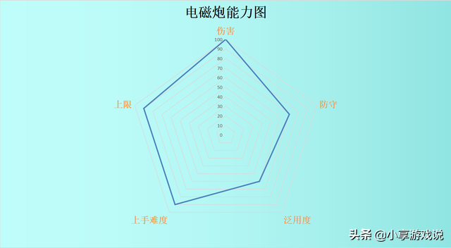 按照伤害,泛用性,上手难度,防守能力,上限雷达图去看的话,电磁炮还是潜力极大的卡牌。