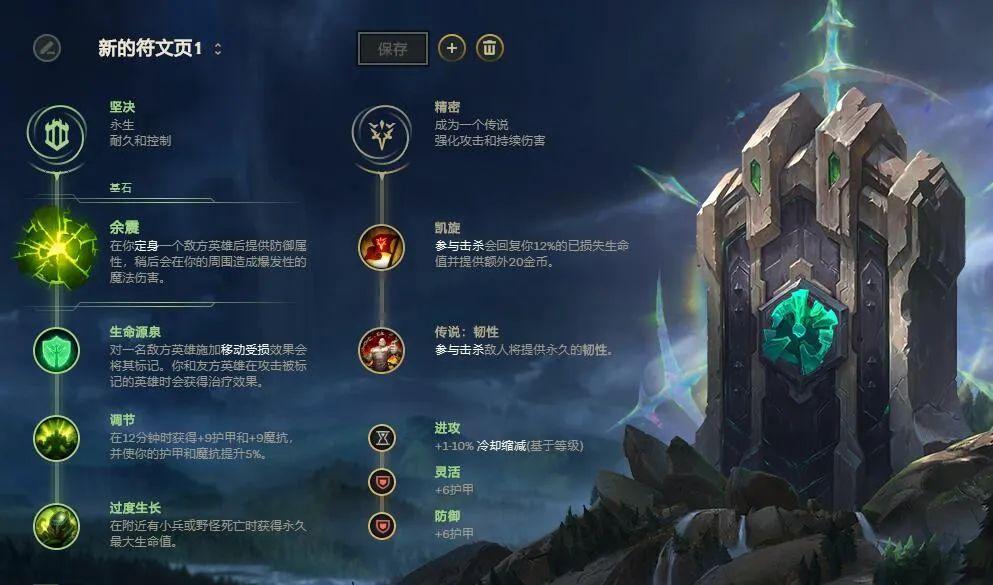 主系符文:余震+生命源泉+调节+过度生长