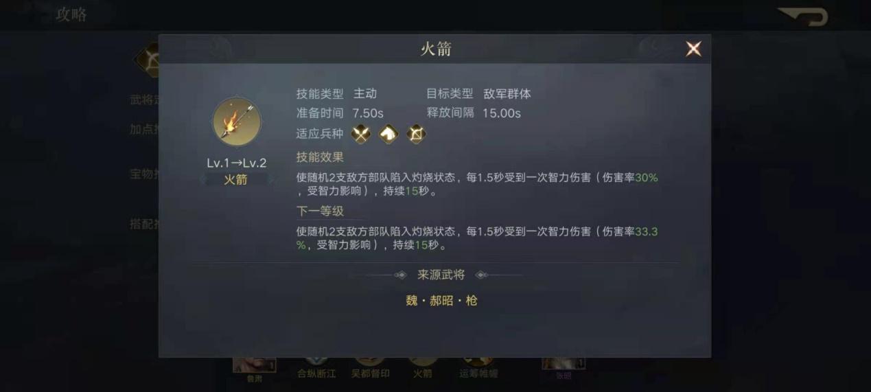 就比如吴国大都督周瑜,专属技能“炽照云海”取自火烧赤壁,可以直接对敌方群体发动智力攻击,若目标已经处于灼烧状态,则直接令伤害翻倍。否则,可以有几率让敌方部队陷入灼烧状态。而宝物火箭,效果是随机让多支敌方部队陷入灼烧状态,搭配周瑜的专属技能,往往能造成大范围的双倍伤害。