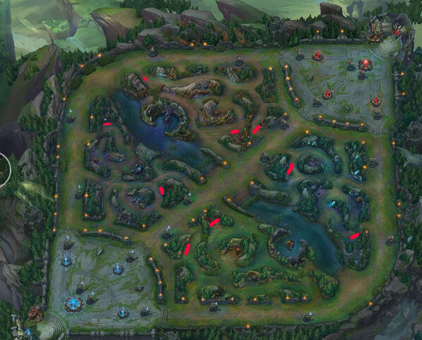 中后期团战末日团战一定是躲在阴影中寻找机会大招进场,所以身上一定要记得带真眼和扫描,不然对面在有防备的情况下很可能就进去送了。没有大招的时候就选择保护己方C位,对面刺客在有末日的情况下是很难进场切死C位的。末日常用的跳大位置我都在下图标出供大家参考。