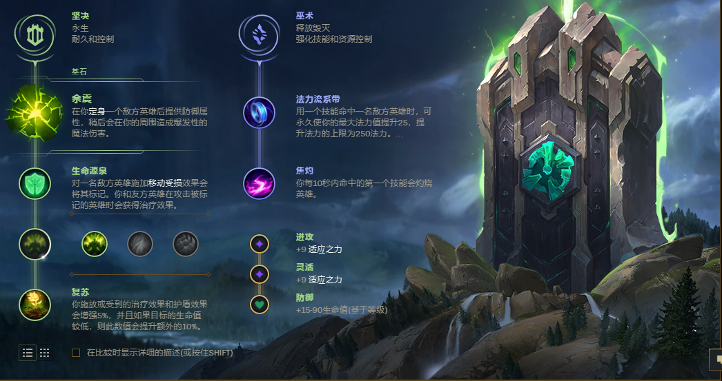 带余震是因为末日的恐惧能很好的触发余震,防止被秒,毕竟末日是非常脆的和丽桑卓带余震有异曲同工之妙,副系选择法力流系带和焦灼,法力流系带提供回蓝,焦灼加伤害。