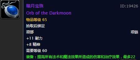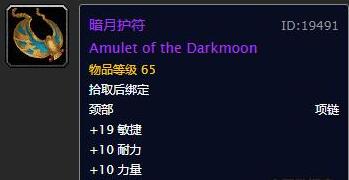 暗月马戏团的项链分两种,物理的项链叫“暗月护符”,19敏捷、10耐力、10力量,这个属性对任何物理职业来说都是非常有吸引力的,而且怀旧服的项链部位非常的稀少,很多玩家到了60级还带着40级做任务送项链;另一种是法系的项链叫“暗月宝珠”,提供11耐力、8精神和22法伤,这个完全可以称为低配版的“火焰之王的项圈”,尤其是22法伤这一点就值得所有法系职业来入手,治疗职业用也是非常好的。
