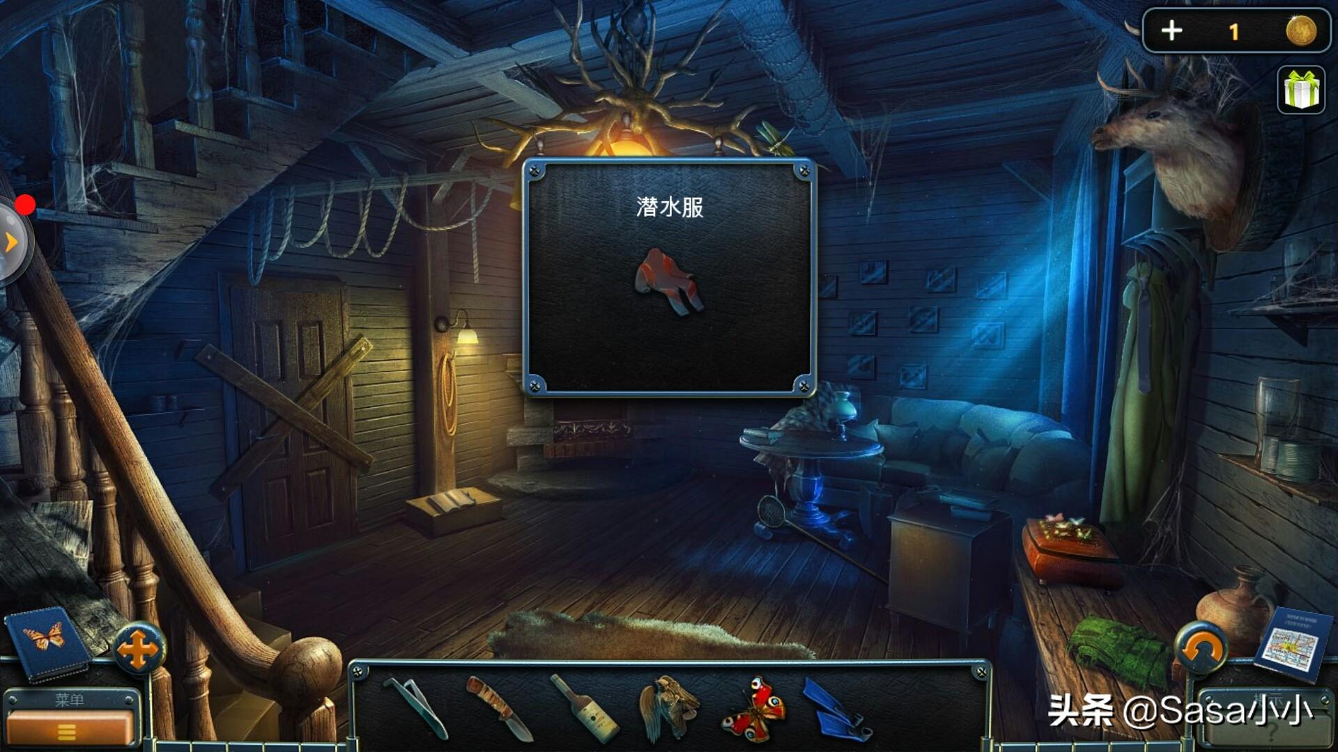 回到【房子场景】,灯泡打开照亮房子内部,在左边箱子上拿到【潜水服】。