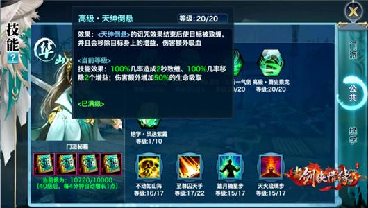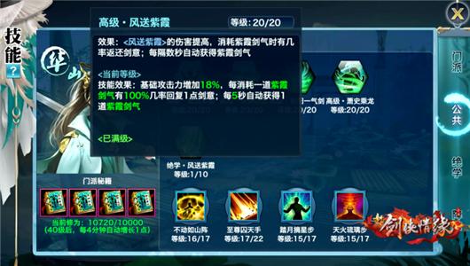 满级秘籍效果:基础攻击力增加18%,每消耗道紫霞剑气有100%几率回复1点剑意;每5秒自动获得1道紫霞剑气。