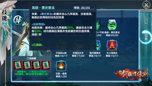 1、萧史乘龙满级效果:最终会心几率提高25%、基础攻击力增加33%;成功施展后清除并免疫属性和负面效果,持续2秒。