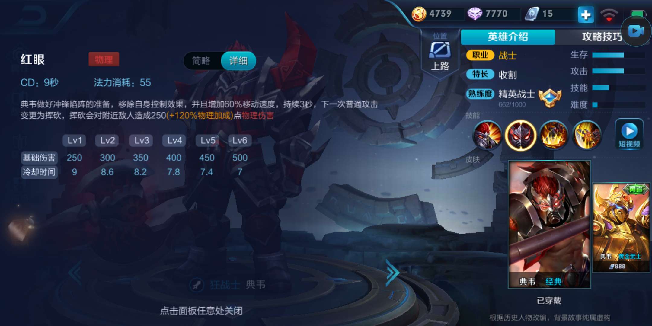 1技能“红眼”可以解除自身控制效果,大幅增加移动速度,并使你的下一次普通攻击变为附带技能基础伤害+百分之120物理加成的范围伤害,这个技能的重点就在于解控和瞬间暴增的移速,是典韦gank战场的核心所在