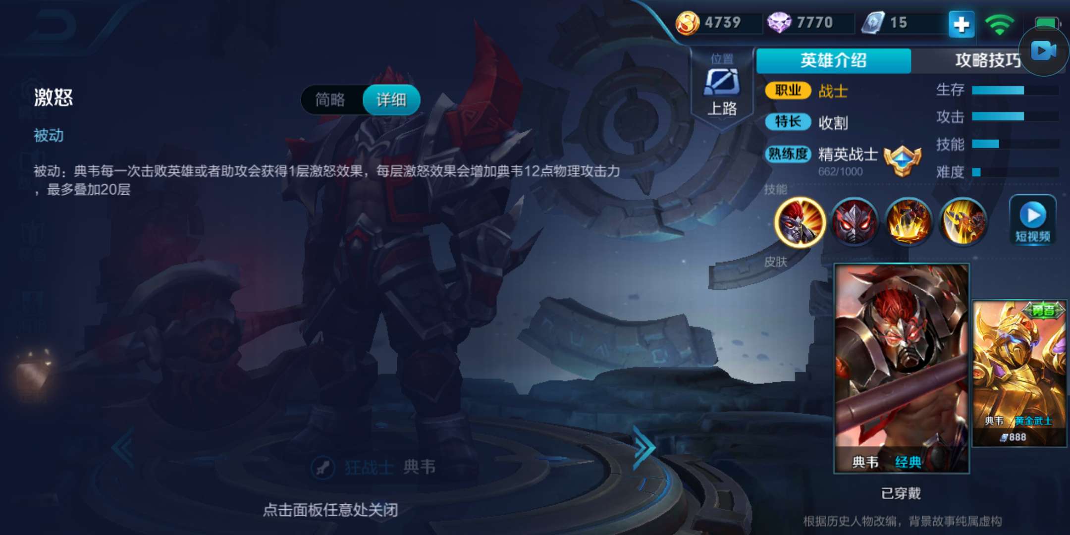 典韦的被动技能是让他炙手可热的重要原因之一,被动技能“激怒”每次击杀或助攻会增加一层buff最高可20层,也就是420点物理攻击力,要知道整个游戏中攻击力加成最高的装备也只是增加200点物理攻击力,在不计其他效果的情况下,这就相当于最少2个大件,
