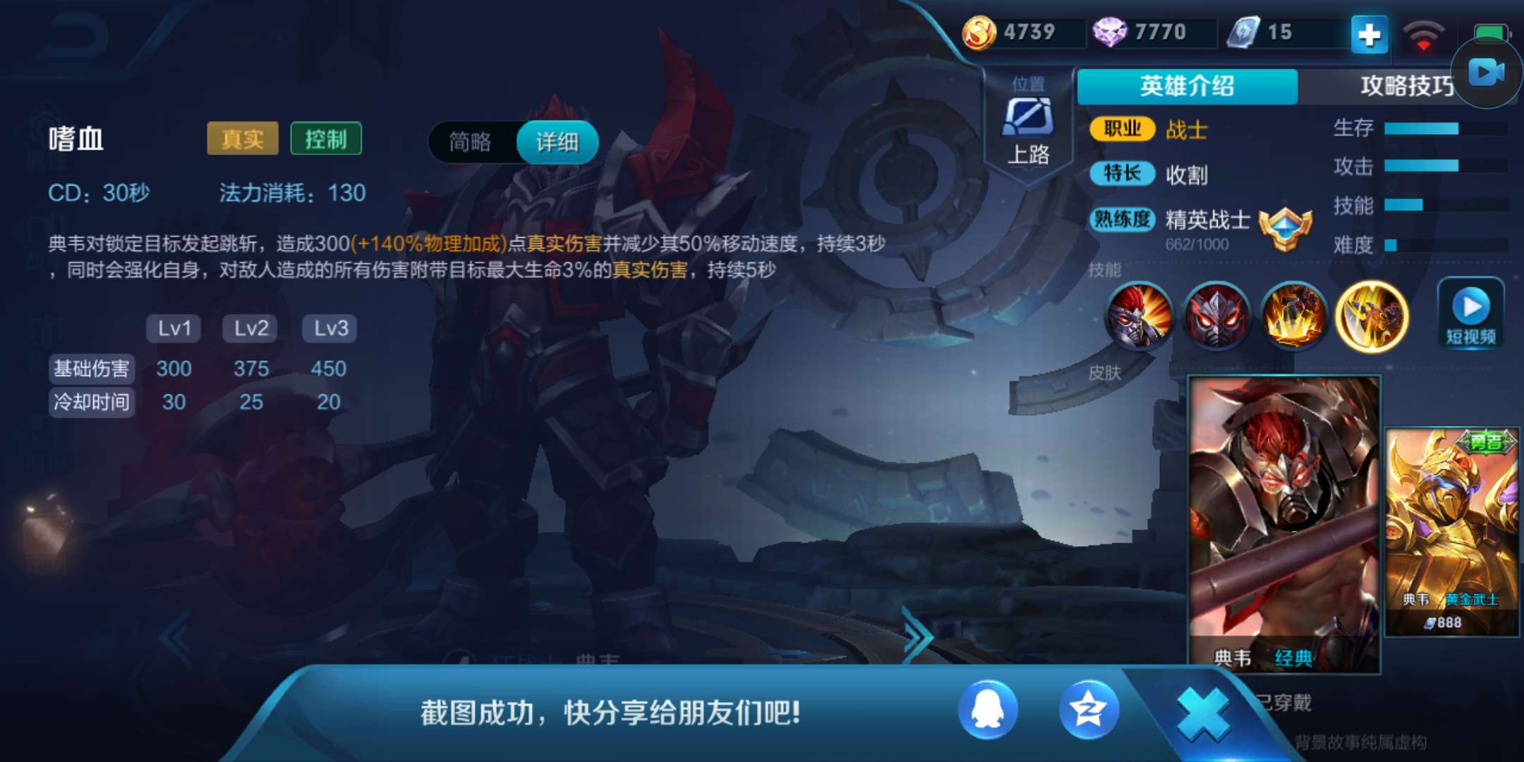 大招嗜血,对目标造成实际情况伤害,并使持续时间内的普通攻击附带目标最大生命值百分比的实际情况伤害,这个技能是典韦输出伤害的核心所在,配合好2技能,谁都不怂!