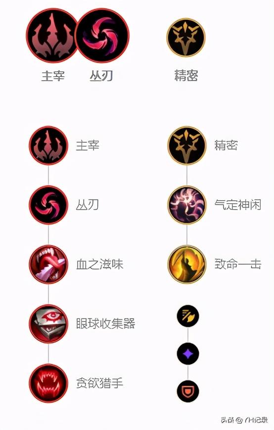 丛刃流老鼠目前十分流行,由于丛刃可行在前三下普攻为老鼠提供巨额的攻速加成,让他可行快速打出三峡普攻来叠加被动以及打出爆发伤害,再加上E技能满层后的高额输出伤害,让老鼠在前期便能发力。后续点出血之滋味来提升老鼠的回复效果,从而提升老鼠再线上的耐线能力。眼球收集器则是在老鼠获得助攻或人头后可行一定等级提升老鼠的攻击力加成。最后点出贪欲猎手为老鼠提供强大的回复能力,尤其是中后期输出起来后,老鼠利用贪欲猎手可以回复大量生命值来提升团战中的持续作战能力。副系建议点出气定神闲以及致命一击,来提升续航能力和斩杀能力。