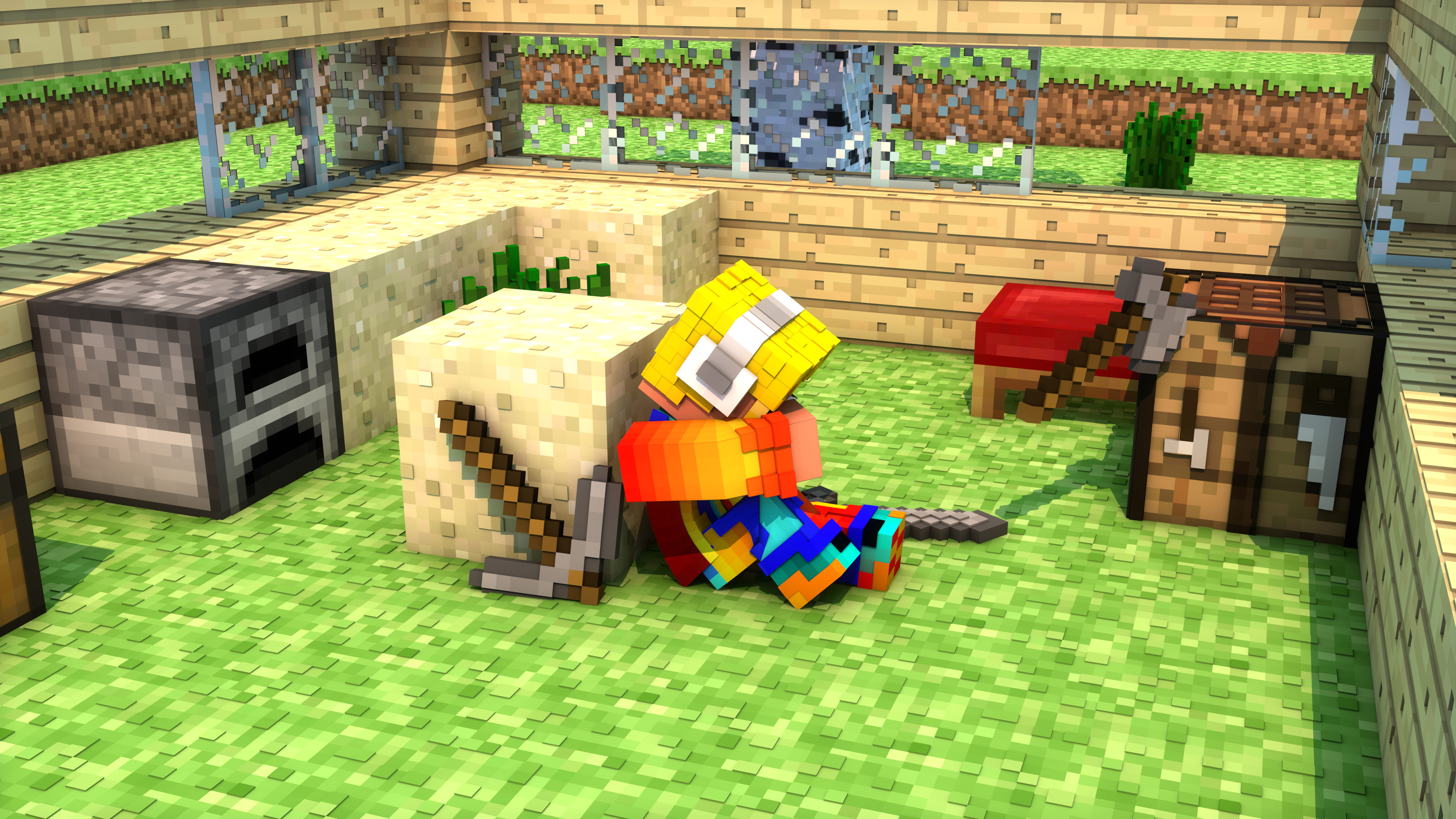 与雕像类似,像素艺术会用到染色羊毛、陶瓦、混凝土或其他材料来创造壮观的2D塑像!找一个低分辨率的图片(或者如果你有足够的能力和耐心,你也可以找高分辨率的),给每个像素分配材料。最后,开工吧!如果你不知道做什么,你可以试着建造一个画上面的。它们本来就是像素画,只需按照上面的像素建造更大一点的一个。