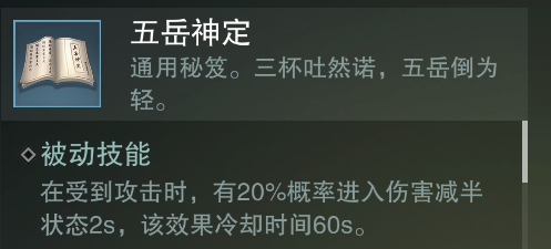 五岳神定:在受到攻击时,有20%的概率进入伤害减半状态2S,该效果有60S的冷却时间,五岳神定是一本非常好用的蓝色秘籍,拥有伤害减半被动触发技能的它,几乎适合所有门派佩戴。