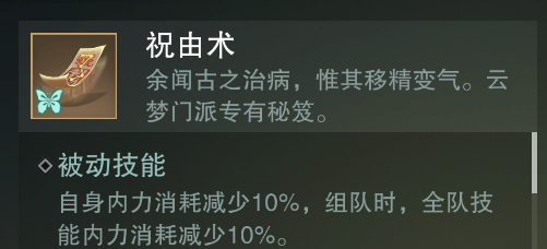 祝由术:使自身内力消耗减少10%,组队时,全队技能内力消耗减少10%,云梦的蓝量和血量一样珍贵,可以减少内力消耗的祝由术对于经常会奶到空蓝的云梦来说,简直是雪中送炭一般的秘籍。